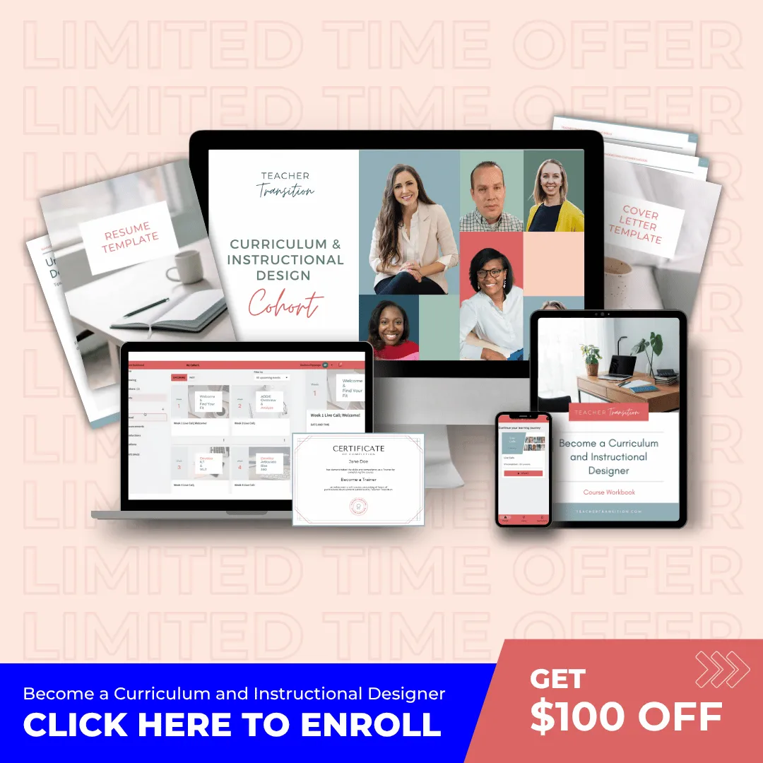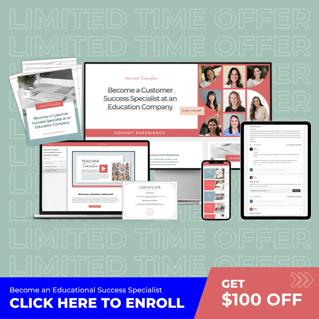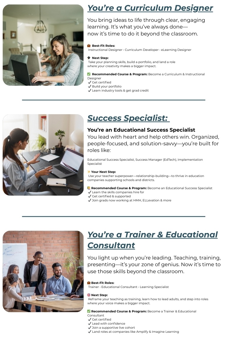 ✅ Understand how your classroom strengths transfer directly to high-demand roles like Curriculum & Instructional Designer, Trainer/Educational Consultant, and Educational Success Specialist.