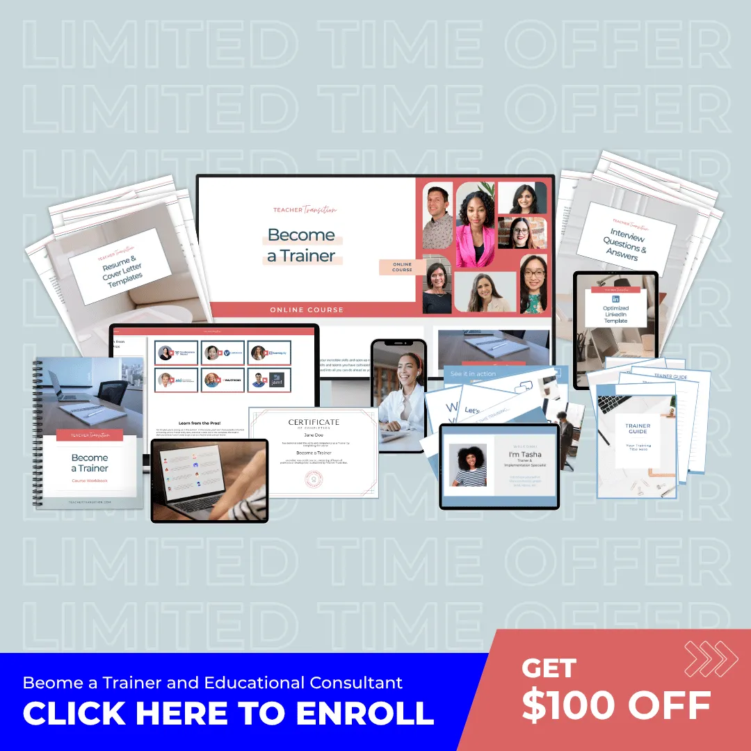Discount Valid for Individual Purchases of these Teacher Transition courses: Become a Trainer, Curriculum & Instructional Designer, or Success Specialist Course.